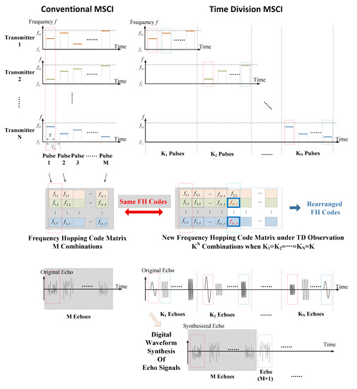 However, there remains an underutilization of the available design scope. For example, as shown in the left part of Figure 3, a random FH based MSCI with N transmitters is considered. The available bandwidth is . The multiple transmitters utilize different frequencies within each pulse duration time. The optimized frequency hopping sequences of M pulses are illustrated as the frequency hopping code matrix. If the available frequencies of each transmitter is K, then the total amount of radiation fields is . For example, for a MSCI system consisting of 10 transmitters with 1000 available frequencies, the amount of radiation fields is . But only M optimized frequency arrangements are selected and utilized. Considering observation time limitations in practical radar systems, M is far less than the exponential term , thus a huge number of available frequencies remains unused. Meanwhile, considering the radiation fields are computed based on precise estimations of the transmitting parameters, in simultaneously emitting based MSCI, the multiple transmitters requires high performance of multichannel consistency and multichannel synchronization, and the unused frequency hopping codes require extra observations to be physically accomplished, which increases the system complexity and detecting cost.