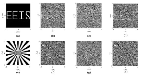 The imaging results of conventional MSCI and TD-MSCI under the same noise level are illustrated in Figure 5, and the RIEs of the recovery results are listed in Table 2. Figure 5b,f are the recovery results of conventional MSCI. Figure 5c,g are results of TD-MSCI without echo enhancement. Figure 5d,h are results of TD-MSCI with coherent integration times of 16. As compared in Figure 5b,d,f,h, the RIE of conventional MSCI and TD-MSCI with the coherent integration time equaling the number of transmitters are close, demonstrating that MSCI based on time-division scheme and digital waveform synthesis achieves comparable imaging performance, which can be further demonstrated by 100 times Monte-Carlo numerical experiments shown in Figure 7. The RIEs of MSCI and TD-MSCI are approximately close, as illustrated in black line and yellow line in the figure.