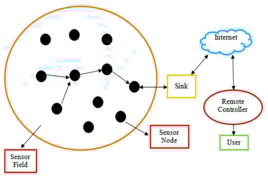 A wireless sensor network (WSN) network is characterized as a small-scale gathering for sensor hubs, especially for sensing, monitoring, capturing, and processing the information concerning an application. Therefore, generally, these hubs completely rely on battery backup, storage, data size, computation, and bandwidth []. Nowadays, WSN has become unavoidable in daily life; hence, many studies tend to focus on specific application properties [].