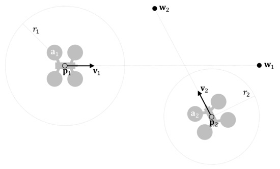 In this work, we assume that all UAV flights are at the same altitude. Consequently, we afford the collision avoidance problem in the 2D plane. Let be the set of UAVs flying over the study area considered at any given time. Each element represents the status vector of a UAV, where , , and are, respectively, its current position, current velocity, and destination. Additionally, is the safety radius, that is, the radius of the UAV’s protected zone. Figure 1 shows an example.