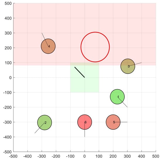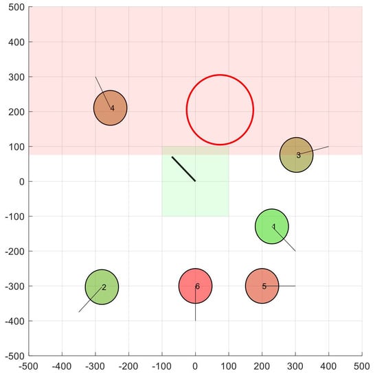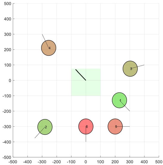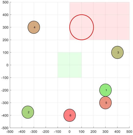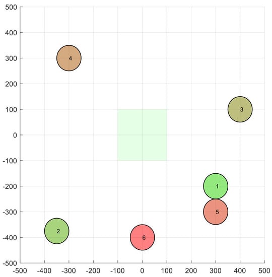 As an illustrative example, Figure 2 shows a scenario with and m. Apart from the 2D location of all nodes (UAVs), the figure shows the velocity space corresponding to node 1. In the origin of coordinates, we can see the initial situation of the green box, assuming m/s.