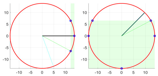 If a direct velocity is not permissible, then we need to determine a vector that is. To do this, we analyze 12 points resulting from geometrically comparing the maximum velocity circle (hereinafter referred to as “the circle”) and the green box representing the valid velocity space (hereinafter referred to as “the box”). First, we would determine the cut points between the circle and the box, both vertically (66) and horizontally (67). In each direction it may be that the circle does not intersect the box but the extension of its sides, in which case (68) it is eliminated as a candidate (69). Visually, this fact means that the candidate point is outside the bounds of the box. Table 7 shows the function that performs this check. If, on the other hand, the intersection is real, this can be a single tangential intersection, or unfolded at two intersections (denoted as positive and negative, respectively). Both situations are handled according to the second option, in which both points would match. We also consider the four vertices of the box (71) as candidates if they are inside the circle (72), discarding them otherwise (73). Note that of the 12 points checked, only 4 to 8 will be maintained, as for each accepted vertex two intersections will be discarded. Figure 8 shows two examples with the twelve candidate points.