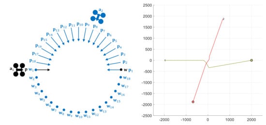 This subsection analyzes the behavior of the BBCA algorithm in a situation , where both UAVs collide depending on the relative angle that their respective trajectories maintain. Figure 10 shows the different scenarios proposed. Given the circumference of a radius of 1 km, a UAV starts from the west () towards the opposite point of the circumference (w). On the other hand, a UAV has 18 different starting points () ranging from 0° to 170° with a 10° interval, associated to the respective target points (). Both nodes start moving simultaneously with a constant velocity of 13.9 m/s (50 km/h), so they will collide at the center of the circumference if the navigation algorithm does not prevent it. A safety radius of 50 m is applied to both nodes, which will cause a pre-crash conflict, at a time that depends on the relative starting angle.