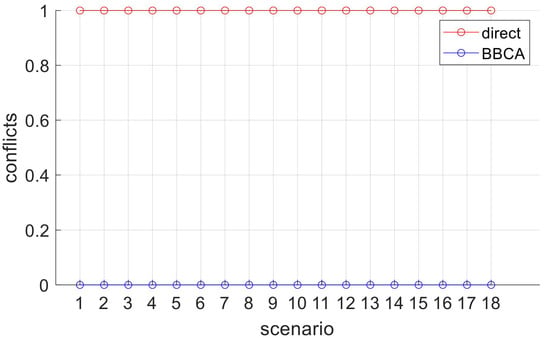 The results obtained for this initial study are shown below. Figure 11 shows on the abscissa axis the scenario number corresponding to the simulation of the two UAVs with the relative paths described above. The ordinate axis represents the number of collisions produced. The series represent the results obtained by the direct and BBCA algorithms, respectively. As expected, the direct algorithm generates conflicts in all paths. On the contrary, the BBCA algorithm manages to avoid them in all the proposed scenarios.