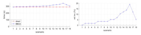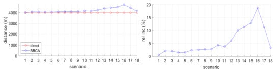 The BBCA algorithm manages to avoid the conflict by making the UAVs deviate from their optimal path, with a consequent increase in the distance travelled and time taken to finally reach their destination. Figure 12 (left) shows on the abscissa axis the scenario number and on the ordinate axis the average distance covered by the UAVs, expressed in meters. The series corresponding to the direct algorithm establishes the minimum route between origin and destination. The BBCA series shows the detour made to avoid the collision, which results in an increase in the distance travelled.