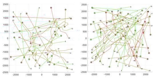 In this subsection we analyze the behavior of the BBCA algorithm when it is applied to groups of UAVs of different sizes, flying over an area of km. In particular, . In each case, 24 different configurations have been generated with random start and destination positions uniformly distributed with the following restrictions: (1) UAVs must be more than 100 m from the flying area edge; (2) the length of the route followed by each UAV must be at least 1 km. Each configuration has been tested using the direct, APF, and BBCA algorithms, respectively, requiring a total of 720 simulations. In all cases, a maximum velocity km/h and a safety radius m have been considered. Figure 14 shows two examples.