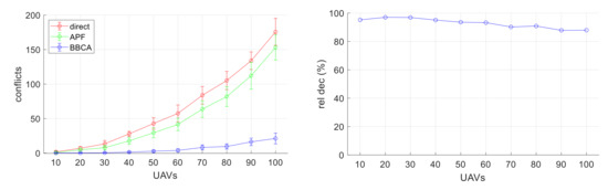 In Figure 15 (left), the abscissa axis indicates the number of UAVs distributed across the flying area. The ordinate axis shows the average value (and standard deviation) of the collisions produced in the 24 simulated configurations. Without the application of a conflict management mechanism (direct), conflicts increase exponentially with the number of UAVs. A generic APF handles isolated conflicts correctly, but its performance dramatically decreases when they affect to multiple UAVs simultaneously. On the contrary, the use of the BBCA algorithm implies a considerable reduction in conflicts compared to not using it. Figure 15 (right) shows that BBCA obtains a reduction in conflicts of around 90% in the worst case.