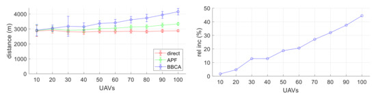 Next, we study the penalty in terms of distance travelled and time spent when BBCA is applied, in a similar way to the study carried out for two UAVs. In Figure 16 (left), the abscissa axis indicates the number of UAVs in the flying area and the ordinate axis shows the distance travelled. Each series shows the average and standard deviation of the values obtained in the different configurations. In the absence of conflict management, the expected situation occurs: the average distance travelled by the UAVs remains constant while the deviation decreases as the size of the group of UAVs increases. On the contrary, the detours introduced by APF and BBCA produce an increase with linear behavior in the distance travelled. Figure 16 (right) shows the relative increase in the distance travelled by UAVs. The linearity in the growth of the routes can be clearly seen. Even in extremely dense configurations, where the algorithm avoids 90% of the collisions, it can be said that the penalty of the distance travelled by UAVs is not excessive.