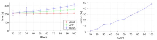 Figure 17 shows the time taken by the UAVs to reach their destination depending on the navigation algorithm used. In both plots, the abscissa axis represents the number of UAVs in the flying area. In the left plot, the ordinate axis represents the time required by the UAVs to reach their destination. Each point corresponds to the average value (and standard deviation) of all the UAVs deployed in a configuration and for the various configurations generated with the same number of UAVs. In the right plot, the ordinate axis represents the relative increase introduced by the BBCA mechanism with respect to the direct one. We can see a behavior of time analogous to the behavior of distance described above.