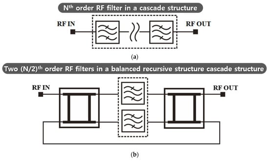 Simple schematic of multi-stage microwave filters with (a) a conventional cascaded structure and (b) the proposed balanced recursive structure. RF: radio frequency.
