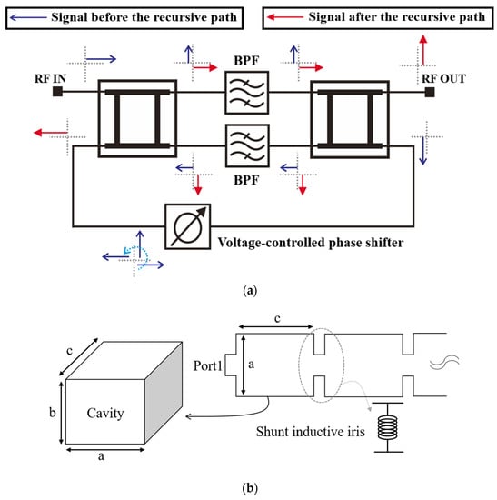 The balanced recursive structure, shown in Figure 2b, was proposed to enhance the reflection characteristics and reliability in the case of filter failure. The input signal is divided by the input hybrid coupler and filtered separately. Then, the filtered signal is recombined through the output hybrid coupler and fed back to the input hybrid coupler for recursive operations. Thus, a cascading effect can be achieved by the same filters without the problems of the conventional cascading method since the hybrid couplers work as buffers. Furthermore, the intrinsic nature of the balanced structure reduces the effect of output load variations since the reflected signals are returned to the isolation port of the input hybrid coupler instead of the input port. If one of the two filters is damaged, the output signal is only partially degraded in the proposed structure; both filters need to be broken simultaneously for the signal to be completely degraded. Due to the outstanding performance being based on the balanced recursive structure, the proposed structure is implemented with a phase shifter in the recursive path, as shown in Figure 3a. Here, the phase shifter adjusts the relative phase of the recursive signal to the incident signal in an orthogonal manner for each BPF to avoid interference. For the proposed structure, the reflection-type phase shifter can be the optimal choice since it has good return characteristics and does not consume additional power.