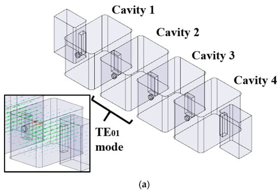 Lastly, a fourth-order waveguide resonator cavity structure using the TE01 mode was designed with the iris coupling, as shown in Figure 3b. The iris can be modeled as a shunt inductance [] and the frequency characteristics of the filter follow a fourth-order Chebyshev response. Having the initial parameters calculated and modeled at a center frequency of 20 GHz within the TE01 mode, the required dimensions were extracted and optimized by using a 3D electromagnetic (EM) simulation tool, as shown in Figure 4a. Furthermore, Figure 4b shows the 3D simulated current distribution at an arbitrary time and the operation mode.