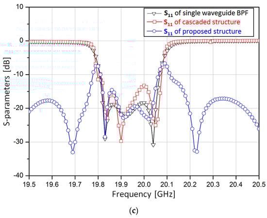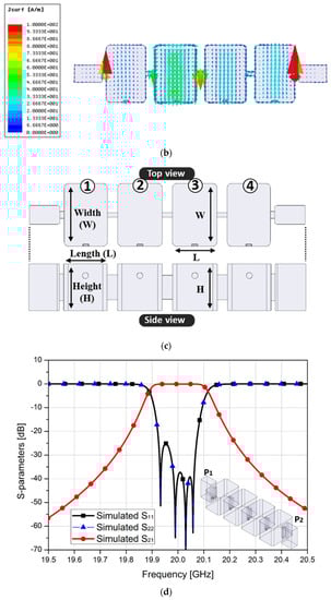 Furthermore, the simulated S-parameters for the fourth-order cavity filter is shown in Figure 4d, where the passband insertion loss was about 0.07 dB at 20 GHz with a 3 dB bandwidth at 200 MHz.