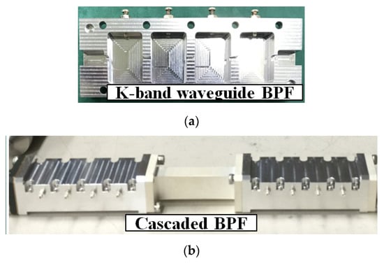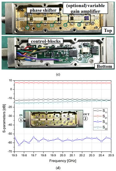 Based on the simulated model, the K-band fourth-order waveguide cavity BPF and two-stage cascaded BPF were fabricated, as shown in Figure 5a,b, respectively. Referring to Figure 3a, the proposed structure requires a phase shifter in the recursive path to ensure the balance in RF signals through both BPFs. If the recursive RF signal is not phase-matched with the incoming RF signals from the input, the total RF signal to each BPF becomes unbalanced, resulting in the degradation of the filter response and absorptive characteristics. Since the high power capability and reliable performance must be ensured for a satellite payload, a reflection type phase shifter with a wideband Lange coupler was designed. The detailed characteristics of the phase shifter are well-described in [,] and are thus omitted from this article. Furthermore, to compensate for the loss of the input and output passive networks connected with the cavity BPFs, a variable gain amplifier was adopted in this work despite not being mandatory for configuring the proposed structure. A commercially available drive amplifier MMIC with a P1dB of 21 dBm and a gain of 17 dB at 21 GHz was used. Figure 5c shows the fabricated recursive path module, which consists of multiple phase shifters to cover 360° and a variable gain amplifier in 0.15 μm GaAs pHEMT MMICs.