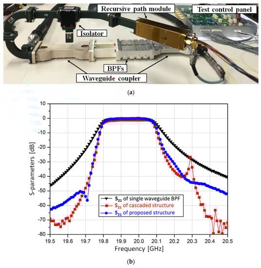 Figure 5d shows the measured S-parameters of the fabricated recursive path module, where the measured input and output return losses were better than 12 dB. Furthermore, the measured transmission gain was about 7 dB, whereas the reverse isolation was higher than 55 dB, showing very stable performance within the operation band. Furthermore, the power consumption for the recursive path module depended on the amplifier showing approximately 220 mW, since the reflection type phase shifters and attenuators were based on passive operations without consuming current. Lastly, an isolator was added to the recursive path to ensure high isolation in the reverse direction during the measurement. The complete measurement setup is shown in Figure 6a. Using the single waveguide BPF as a reference, two-stage cascaded BPF and the proposed structure were measured from 19.5 GHz to 20.5 GHz, as shown in Figure 6a,b. Compared to the single BPF, both structures showed improved roll-off characteristics. However, the two-stage cascaded structure showed an unexpected peak at the stopband of 20.3 GHz, while the proposed structure showed a more stable performance. The 3 dB passband of the proposed structure was 280 MHz, as shown in Figure 6b, and the return characteristics in the passband were better than −10 dB, as shown in Figure 6c. Furthermore, the stopband return characteristics were better than −7 dB. Therefore, for any arbitrary number of filters, the proposed recursive structure could provide improved roll-off characteristics equivalent to the cascaded structure, as well as excellent absorption characteristics in the stopband.