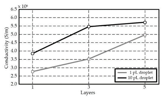 Conductivity values (σAg,150 °C) of an inkjet-printed silver nano-particle trace after thermal sintering at 150 °C with 20 µm drop spacing (1024 dpi).