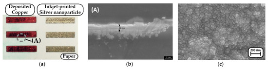 (a) The deposited copper traces (50 min) utilizing the palladium catalyst ink in comparison with the inkjet-printed silver nanoparticle traces. (b) Cross section and (c) surface of the copper grown on the cellulose-based paper.