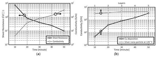 (a) Sheet resistance and conductivity values of the grown copper layer as a function of the immersion time in the copper bath and (b) conductivity values of the grown copper layer and the inkjet-printed silver nano-particle as a function of the development time in the copper bath and the printed layers.
