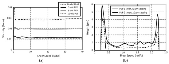 (a) Rheometric analysis and (b) thickness of the poly (4-vinylphenol) (PVP)-printed ink.