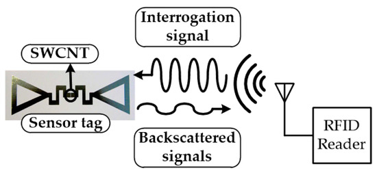 RFID-enabled sensor systems have demonstrated a great potential as low-power, low-cost wireless sensor platforms [56,57,58,59,60,61,62,63,64,65] featuring a relatively simple architecture compared to conventional wireless sensor systems and good compatibility with conventional Wireless Sensor Networks (WSN) [66]. In this section, an inkjet-printed RFID-enabled CNT gas sensor is introduced, and Figure 11 shows its operation principle [67]. An RFID reader interrogates the sensor tag and its backscattered electromagnetic (EM) wave is monitored. The sensor tag has a sensor component that consists of an inkjet-printed single wall carbon nanotube (SWCNT) film acting like a tunable resistor. A resistance value is determined by the concentration of the sensing target gas, such as ammonia (NH3) gas. The event decision (or gas detection) can be made by monitoring the backscattered wireless power levels because the electrical characteristics of the loaded SWCNT film vary due to different NH3 concentrations.