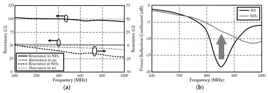 The measured thickness of the 25-layer printed SWCNT film on cellulose paper was about 7 µm. At the European UHF RFID frequency band at 868 MHz, the impedance value of the inkjet-printed SWCNT film was in air (no presence of NH3 gas), while the impedance value changed to in NH3. The variation of the impedance and reflected power from the RFID-enabled SWCNT gas sensor are shown in Figure 12 to demonstrate the operation principle of the RFID-enabled sensor. The reflected power level of the sensor tag in air was −18.4 dB, while that of the sensor tag in NH3 was −7.6 dB.