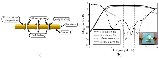 Numerous RF applications require shielded/waveguide configurations due to requirements for reduced interference and/or a high power. Substrate-integrated waveguide (SIW) structures are similar to dielectric-filled waveguide structures, but feature more lightweight configurations due to the use of metalized via rows instead of solid metal walls. This topology is especially promising for microwave and millimeter-wave applications because it allows for whole-system integration on one substrate [68,69,70]. As a first step for realizing an inkjet-printed SIW structure on a paper substrate, via fabrication technology utilizing a copper rivet and conductive epoxy has been reported in [71] (Figure 13a). The via holes are drilled using a mechanical drill. This approach does not require any surface treatments and is a completely dry process. A laser drill is also a good candidate for the via hole drilling, but substrates, such as paper, can be damaged due to the heat generated by a laser drill. For the via hole metallization, copper rivets are inserted, and they are concealed using a conductive epoxy. The inset in Figure 13b shows a fabricated prototype of a microstrip-to-SIW transition. Its measured frequency responses (|S11| and |S21|) are also shown in Figure 13b. The dashed lines are reflection coefficients (|S11|) and the solid lines are insertion loss (|S21|) of the fabricated SIW structure. The transitions have been designed for an operation frequency above 5 GHz with a cutoff frequency at 3.75 GHz. The pitch of the vias is 1.6 mm and the diameter of the via is 0.8 mm. The substrate consists of three-layer stacked cellulose paper to achieve a thickness of 0.69 mm. The insertion loss of the fabricated SIW component was 0.5 dB/cm at the center of the pass band. The differences of the measurement and simulation were mainly due to the fabrication error and modeling issue of the conductive epoxy, which are not included in simulations because of the modeling simplicity.
