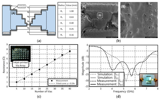 The stepped via hole was drilled using a CO2 laser, and five layers of silver nanoparticles were printed on both the top and bottom sides of each substrate. The SEM images of the inkjet-printed stepped via hole showed a continuous inkjet-printed silver nano-particle layer (Figure 14b). Figure 14b-(A) corresponds to the dashed box in Figure 14a, and Figure 14b-(B) corresponds to the dashed box in Figure 14b-(A). A single inkjet-printed stepped via hole on a 1 mm thick PMMA substrate had a resistance of 7.4 Ω. This result verified the feasibility of the implementation of inkjet-printed via-enabled multi-layer structures on various substrates. Figure 14c,d presents design examples using the proposed inkjet-printed stepped via structure. A series of 40 connected printed stepped vias on 0.8 mm thick RT/Duroid 5880 [76] only has a resistance value of 7.8 Ω. The measured S-parameters of a microstrip-to-SIW transition with 1 mm thick stepped via walls show good agreement with the simulation.