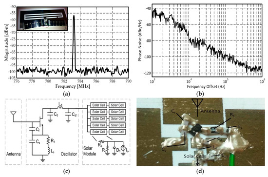 Besides the passive components on paper substrates, inkjet printing technology has successfully implemented more complicated systems including active components. An inkjet-printed active antenna on paper for wireless power transfer and identification has been reported in [85]. The fabricated solar-powered beacon oscillator (active antenna) operates at around 800 MHz and consists of a slot antenna, voltage-controlled oscillator, voltage regulator, and solar cells (Figure 15a). It is hybrid printed electronics technology that takes advantage of nano-particle printing and cutting-edge discrete silicon devices. The oscillation frequency can be scaled up to any desired operation frequency. For stable oscillation of the oscillator, a 1.8 V voltage regulator was integrated with solar cells to supply self-sustainable power to the active antenna system. The performance of the inkjet-printed beacon oscillator on paper was measured by using a spectrum analyzer (Figure 15a). The oscillation frequency was observed at 783.2 MHz (Figure 15a) and the measured phase noise was about −118 dBc/Hz at 1 MHz away from the carrier frequency (Figure 15b). Its circuit schematic and fabricated oscillator on the inkjet printed circuit layout are shown in Figure 15c,d. Conductive silver epoxy was applied to connect circuit components.