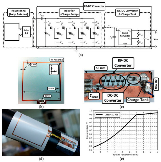Copper is compatible with the soldering process and low-cost material compared to silver. However, it is challenging to print copper directly due to its high sintering temperature [91,92]. Novel hybrid printed electronics using an indirect copper printing process were introduced in [93]. The circuit layout and antenna are printed and other circuit components, such as balun, diodes, and DC-DC converters, are soldered on the printed copper film, as shown in Figure 16. The proposed RF-DC converter consists of an antenna, charge pump for rectification, and DC-DC converter for voltage boosting, as shown in Figure 16a. The charge pump rectifies the RF signal and boosts the DC voltage to the threshold voltage of the DC-DC converter. The DC-DC converter steps up the input voltage and supplies power to a load. The fabricated system is shown in Figure 16b,c. Its performance is also shown in Figure 16c,d. The RF-DC rectifier fabricated on the indirectly printed copper showed good flexibility. It demonstrated a flexible RF energy harvester using a novel hybrid printed technology on low-cost polymer substrates such as Teslin [93]. The fabricated prototype generates an open circuit voltage of more than 2.9 V when it is exposed to a power density of around 1 μW/cm2 at a 900 MHz UHF RFID frequency range. A low-power mode microcontroller is modeled as a 4.72 kΩ load since it drains about 200 nA at 0.9 V, as shown in Figure 16e. It shows that the designed RF energy harvester has successfully generated enough power to operate the low-power mode microcontroller continuously when it is able to harvest 0 dBm RF power from the surrounding environment.