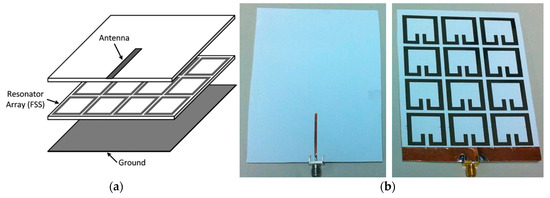 In this section, an inkjet-printed artificial magnetic conductor (AMC) surface is discussed. The general structure of the AMC surface consists of a frequency selective surface (FSS) and a ground plane, as shown in Figure 17a. It is a sort of electromagnetic bandgap (EBG) structure or high impedance surface (HIS) that prohibits wave propagation at a certain frequency band [94]. Numerous shapes have been reported for AMC surfaces for various applications [95,96,97,98,99,100]. The AMC surface suppresses back radiation of an antenna and significantly improves the antenna gain. The distance between AMC and the antenna is relatively short (λ/4) because the phase of a reflected wave from the AMC surface results in constructive interference with the waves radiated from the antenna. However, waves radiated from an antenna experience destructive interference when the waves are reflected by a PEC surface since the reflected wave is out-of-phase. Therefore, the induced current on the AMC surface is in-phase with the current flow of the antenna. Recently, a reconfigurable meta-surface structure, such as a reconfigurable intelligent surface (RIS) for 5G/5G+ or 6G, is attracting great interest [101,102,103,104]. The RIS reflects the incident wave in the desired reflection angle by adjusting the reactance of a unit cell.