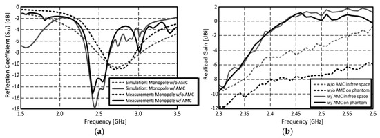 There are unit cell shapes, and widely adopted unit cell shapes, split ring resonator (SRR) (Figure 18a) and single hair pin resonator types (Figure 18b), are shown as design examples. The phase response is a critical design parameter of the AMC surface because it indicates constructive or destructive interference. The reflected wave should have ±90 degrees to result in constructive interference with radiated waves from an antenna. As a design example, a monopole antenna was placed on a printed AMC reflector (Figure 17). Its AMC reflector consisted of a 3 4 hair pin type resonator array, as shown in Figure 18b. The designed antenna was mounted on a human body phantom to demonstrate the performance of the AMC reflector. The AMC reflector successfully suppressed the loading effect of the human phantom, as shown in Figure 19. The measured |S11| on the phantom was almost the same with the antenna in the free space (Figure 19a). There was a clear difference in gain values, as shown in Figure 19b. On the lossy human phantom, there was only about 0.2 dB gain drop at 2.45 GHz with the AMC reflector, but about 4 dB gain drop was observed without the reflector. This clearly shows that the printed AMC reflector boosts antenna gain and isolates the antenna from the surrounding environment.