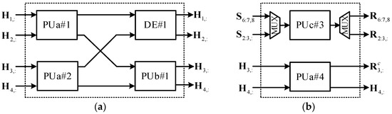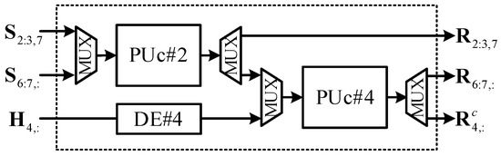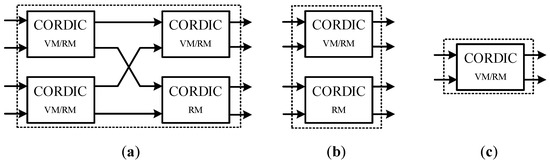 Figure 5, Figure 6 and Figure 7 present the block diagram of the proposed processing engines (PEs). All these PEs comprise three kinds of CORDIC-based Givens rotation structures: processing unit a (PUa), processing unit b (PUb), and processing unit c (PUc). Figure 8 shows their architecture based on CORDIC module, all of which can work in vectoring mode (VM) and rotation mode (RM). In VM, elimination operation is applied to the leading column elements of the current input matrix; in RM, the rotation directions generated in the vectoring mode are retrieved for rotation operations of subsequent elements. PUa processes paired complex rows, zeroing the lower one and turning the upper one into a real number [25]. In vectoring mode, the upper-left three CORDIC modules are used, whereas in rotation mode, all of the four CORDIC modules are occupied. PUb is used for the paired rows of which the leading elements are real numbers and the rest are complex numbers. In vectoring mode, the upper CORDIC module processes the leading paired real elements and zeros the lower one; in rotation mode, the two CORDIC modules are used for the rotation operations of the following complex elements. PEc with only one CORDIC module processes paired real inputs. As these processing units have different processing delays (PUa has two CORDIC stages, whereas PUb and PUc have one), delay elements (DEs) are used to align the data sequences for the subsequent processing unit or sorting module. Among all these Givens rotation structures, all the processing units in PE#1 and PE#2, PUa#4 in PE#3, and PUc#2 in PE#4 are used for SCGR, whereas PUc#3 in PE#3 and PUc#4 in PE#4 are dedicated to RGR. The processing units with multiplexers (MUXs) at input and output ports, including PUb#2 and PUc#2–4, form the time-sharing Givens rotation structure, which will be introduced in the next subsection.