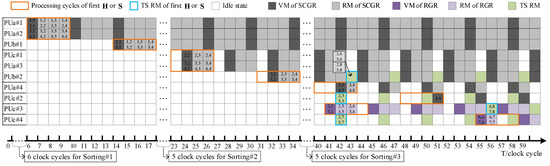 Figure 9 shows the deeply pipelined processing flow of the proposed SQRD processor with time-sharing Givens rotation structure. The index in the box denotes the element being processed in the th row and th column of the first during SCGR procedure or the first during RGR procedure. In the SCGR procedure, after the process of sorting#2 is done, PUc#1 and PUa#3 in PE#2 stay idle at the first clock cycle of the processing cycles and process the three columns of the current input 3 × 3 matrix in the other three clock cycles; PUa#4 in PE#3 is in an idle state for the first half of every processing cycle and processes the two columns of the current input 2 × 2 matrix in the second half; then, PUc#2 in PE#4 processes the remaining at the last clock cycle of the processing cycles and stays idle for the other three clock cycles. In the procedure of RGR, the elimination of in the first performed by PUc#3 in PE#3 in vectoring mode starts at the 41st clock cycle when , i.e., , and , i.e., , are obtained after the processing in sorting#3; PUc#4 in PE#4 will eliminate in vectoring mode at the 55th clock cycle after , i.e., , is obtained from the process of PUc#2. With a time-sharing Givens rotation structure, part of the rotation operations of PUc#3 and PUc#4 performed on the subsequent elements shown in Figure 4 are reasonably assigned to the suitable processing units in an idle state. As illustrated in Figure 9, the rotation operations of , i.e., , and , i.e., , are separately assigned to the two CORDIC modules in PEb#2 because PEb#2 is just idle when and are generated. For a similar reason, the rotation operations of , i.e., , , i.e., , and , i.e., , are assigned to PUc#2, PUc#4, and PUc#3, respectively. If no time-sharing Givens rotation is adopted, as shown in Figure 10, an additional PUc#5 must be used for helping PUc#3 with the rotation operations to match the processing rate of SCGR because it will take seven clock cycles for PUc#3 alone to finish the Givens rotation of the seven paired elements of , which exceeds the processing cycles of SCGR. Furthermore, it will cost more delay buffers (DBs) for the aligning of the relevant elements for modified RVD, because the process is extended with only three processing units (PUc#3, PUc#4, and PUc#5). Therefore, with time-sharing Givens rotation structure, one CORDIC module and eight DBs (a DB contains bit registers; is the adopted bit-width) are saved and the hardware efficiency of the entire SQRD is improved.