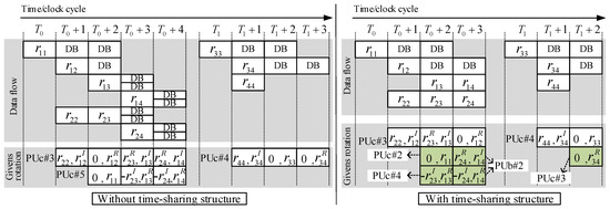 During the SCGR procedure for 4 × 4 MIMO system described above, the current input matrix of PE#2 is of the size 3 × 3 after the elimination process of the first column of with PE#1. With the sorting procedures inserted in the column elimination processes, the Givens rotation structures of PE#2 process only three columns and stay in an idle state for one clock cycle within every processing cycle (four clock cycles). Similarly, the periods of idle state of PE#3 and PE#4 in every processing cycles are two and three clock cycles, respectively. As a result, quite a few processing units are operating in an unsaturated state, which causes inefficiency of the SQRD hardware architecture. On the other hand, the elimination process of non-zero elements below the diagonal of in RGR needs many Givens rotation operations which are independent of the process of SCGR. Given this, we design a time-sharing (TS) Givens rotation structure to take advantage of these idle states mentioned above to share parts of the Givens rotation operations in RGR, which can save hardware cost as well as improve hardware efficiency.