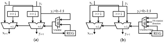 Architecture of micro-rotations of adopted CORDIC module: (a) micro-rotation for normal CORDIC module; (b) micro-rotation for time-sharing CORDIC module.