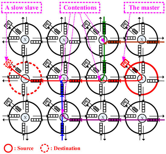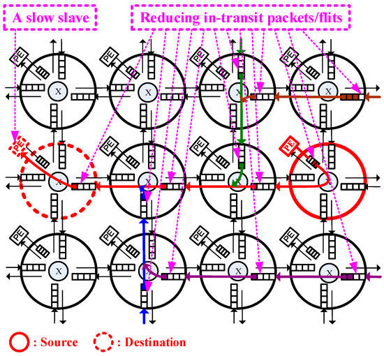 Contentions can be alleviated by both congestion control and flow control because “Congestion control keeps the router network free of traffic jams; while flow control ensures that no transmission master overwhelms any of its counterpart slaves” [13]. Congestion control and flow control were both extensively used in NoCs. For congestion control, adaptive routing schemes [14,15], can be used to forward packets around the contentious regions. In NoCs, most congestion control schemes select profitable routing paths by monitoring some forms of buffer fill level [7,9,10,16,17,18,19,20]. NoC link-layer (node-to-node) flow control schemes [6,8,20,21,22], are developed to prevent buffers overfill between neighboring nodes. Moreover, transmission-layer (end-to-end) flow control schemes mitigate network traffic congestions by exchanging buffer fill messages (credits) between the transmission pairs [23,24,25,26]. However, credit traffic will consume a substantial amount of bandwidth [13]. Accordingly, most NoCs, such as [27], only apply the link-layer flow control to result in a chain of queued flits. Then the transmission flow control can be automatically obtained by the chain of queued flits between transmission ends [13]. Meanwhile, the network becomes congested. Some hybrid-layer flow control schemes [8,28,29,30,31] were proposed to achieve a better tradeoff between the link and transmission layers. These aforementioned traffic control schemes refer to the static buffer fill information to make decisions for flit and packet movements.