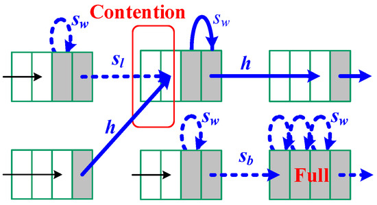 where the length of a packet in a number of flits (pf) causes latency from receiving the head flit to the tail flit at the destination node. The hops (h) occur when flits are moving toward the next nodes (i.e., the buffer is in a fluid state). The length of packets and total number of hops are fixed and cannot be reduced to optimize the latency performance. On the contrary, stalls (s) are states when flits are waiting for grants to move ahead (i.e., the buffer is in an un-fluid state). Flit stalls are caused by resource contentions and should be considered as a key factor for incurring excess latency. Accordingly, Figure 4 shows a simplistic view of streams in six buffers; each arc represents a transition that the flit will take on next cycle. A flit, not being able to move out of the buffer, may be caused by a stall of buffer full (sb), a stall of link unavailable (sl), or a stall of waiting in the queue (sw), where the flit is not at the front of a buffer. Flit stalls can be represented as: