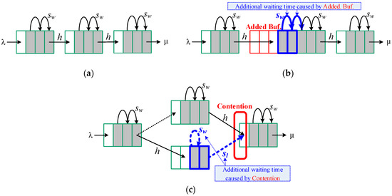 Latency analyses in cases of (a) a single path with a buffer size of twelve, (b) a single path with a buffer size of sixteen, and (c) two alternative paths with a buffer size of sixteen. The packet arrival rate is close to the packet service rate in a congested network. The throughputs in (a,b), and (c) are similar, but the latency in (a) is less than the latencies in (b,c).