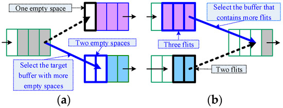 (a) Congestion avoidance selects a target buffer with more empty space and (b) congestion relief selects a source buffer with more flits.