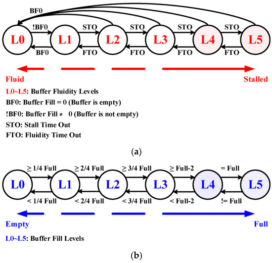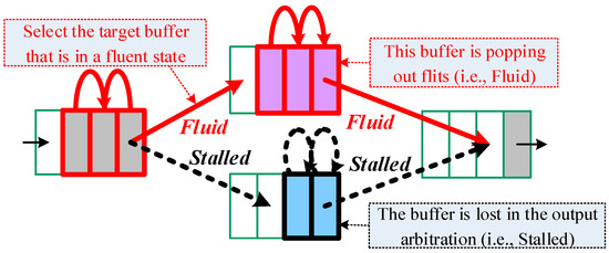 Conventional congestion control schemes depend on some forms of buffer fill level information to dynamically select routing paths [7,9,16,17,18,19]. Differently, we applied the proposed concept of buffer fluidity level in [11]. When compared with the buffer fill level that indicates the queue length of a buffer, the buffer fluidity level reflects the operation status of a buffer, such as the fluid and un-fluid (or stalled) states that are shown in Figure 7.