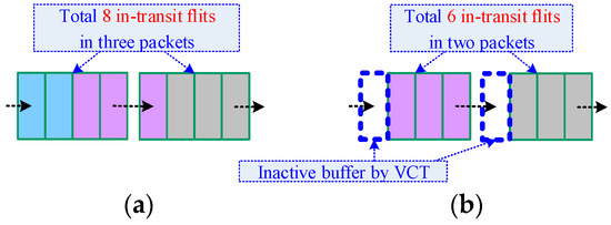 Shin and Daniel proposed a hybrid switching scheme [28], which dynamically adopts wormhole or virtual-cut-through switching to obtain a better performance balance between latency and throughput. Accordingly, we observed that, in a light traffic-load network, wormhole switching performs better than virtual-cut-through in throughput performance. On the contrary, in a heavy traffic-load network, the latency can be reduced by virtual-cut-through, since it causes less in-transit packets (two packets) than wormhole does (three packets). Figure 8a,b show the scenarios.