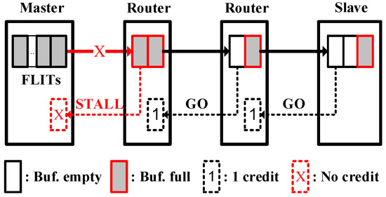 On the other hand, transmission-layer (i.e., end-to-end) flow control conserves buffer spaces in the network by regulating the packet injection rate right at the transmission source [23,24,25,26]. However, the conventional credit-based (or token-based) end-to-end flow controls that are applied in macroscopic networks indeed require computation and communication overheads in both transmission master and slave. Besides, the end-to-end communication delay makes the credit received at the receiving end not able to timely reflect the traffic condition at the transmitting end. These overheads become more critical in an on-chip environment and lead to considerable bandwidth loading (31% as quoted in [33]) and unpredictable communication delay in exchanging traffic conditions between transmission pairs, as described in [13]. In our opinion, the implementation of overheads should be discussed globally from a system viewpoint to validate the practice.