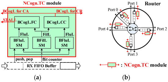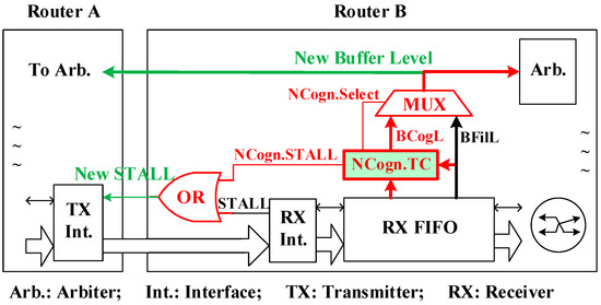 - Second, CARRS [11] applies the primitive wormhole switching as its flow control method (at link-layer, between neighboring nodes). However, as previously discussed, CARRS [11] could waste useable buffer space due to the simple three-level fluidity state, and lead to a reducing length of macro-pipeline of flits [32]. By contrast, this paper implemented the Buffer Cognition Monitor (BCogM; cf. Section 4.2.1), which is applied by the Buffer-Cognition-Level Congestion Control (BCogL.CC; cf. Section 4.2.2) to reduce the length of macro-pipeline of flits when detecting possible congestions that existed between transmission-layer source and destination (i.e., end-to-end). Especially, the proposed Buffer-Cognition-Level Flow Control (BCogL.FC; cf. Section 4.2.3) can further select to buffer more flits to enhance the global throughput performance when congestions are encountered locally between neighboring nodes (i.e., node-to-node).
