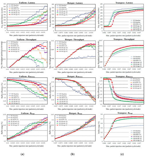 The transpose traffic pattern is a kind of specific operations that is similar to the Matrix-Transpose pattern. The communication graph can be visualized as a number of concentric squares on which the source and destination pairs lie between northwest and southeast areas of the mesh. In such a communication scenario, half of all uni-directional links are unused for XY routing, consequently leading to the extra low buffer usage, as shown in Figure 14c (bottom). On the contrary, Odd-Even can utilize all routing paths, thus it can perform much better. When compared with the only latency data in Odd-Even [15], we analyzed both latency and throughput. We found that the throughput is saturated much slowly, and the latency is finally saturated due to the regular traffic behavior compared to Uniform and Hotspot. It is notable that OE-NCogn.TC achieved the lowest latency and the highest throughput when compared with other traffic control schemes. Referring to Table 4 and Figure 15, OE-NCogn.TC averagely improves OE-Baseline 20.00% in latency, 8.94% in throughput, 9.96% in buffer efficiency, and −6.22% in buffer usage.