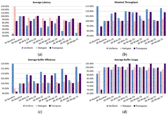 In accordance with Table 4, we normalized each data to OE-Baseline (100%) and then showed them in Figure 15, in which we observed some meaningful performance phenomena among most traffic control schemes, as follows: (1) XY-Baseline behaves diversely among different traffic types due to its non-adaptive routing property. (2) In congestion controls, CC performs better than CA and CA is better than CR. (3) Adaptive routing selections in BCogL can achieve more performance gains than in BFilL. (4) Except for XY-Baseline under uniform traffic, NCogn.TC performs the best among all traffic types. (5) The average buffer usage of Hotspot in Figure 15d is higher than that of Uniform, but the average buffer efficiency of Hotspot presented in Figure 15c is much smaller than that of Uniform, the reason is that Hotspot causes more waiting packets due to traffic jams than Uniform. (6) XY-Baseline has an ultra-low buffer usage in transpose traffic due to the imbalanced link utilization. (7) Basically, buffer usage and efficiency are in direct proportion; however, it is notable that NCogn.TC has the lowest buffer usage but has the highest buffer efficiency among all traffic control schemes based on Odd-Even. These statistics can validate the outstanding performance metrics of both low latency and high throughput by utilized our proposed NCogn.TC scheme.