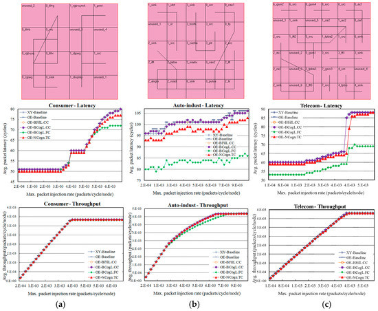 As we know, real data transmissions of MPSoCs are much regular than synthetic patterns. Therefore, we used E3S benchmarks from the Embedded Microprocessor Benchmark Consortium (EEMBC) [39], to realize the variations. The experiments used the same setting for synthetic traffics, but each of the three adopted real traffic patterns: consumer, auto-indust, and telecom, was repeated 100 times and run on a 4 × 4, 5 × 5, and 6 × 6 mesh, respectively. In our experiences, the task mapping of a communication graph on the mesh can greatly influence the final performance result in different manual assignments. Task mapping shall put tasks with heavy communications closer to optimize the total communication cost. For a fair comparison, here we adopt a public simulated annealing tool [40] and show its task mapping results in Figure 16 (top). The cost function for task mapping is: