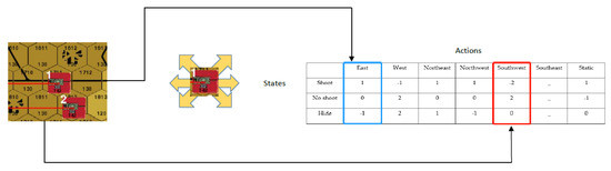 Among them, the maneuverable directions of the operator are 7 states of East, West, Northeast, Northwest, Southeast, Southwest and Static, which are defined as 0~6 respectively, as shown in Table 2. The firing states of the operator in one cell are shooting, not shooting and concealing.