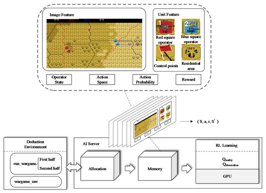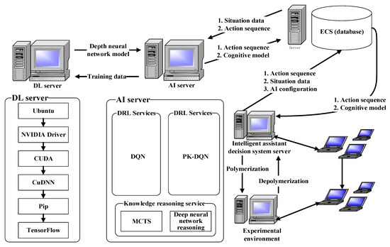 The whole environment includes the DL (Deep Learning) server and AI server. The AI server is configured with the DQN algorithm and PK-DQN algorithm for data training, which is transmitted to the DL server after training to form a deep neural network model. The cloud server transmits the original confrontation data and action sequence to the AI server, and receives the action sequence and cognitive model processed by the AI server. The cognitive model and action sequence formed are further transmitted to the intelligent decision-making system, and then to the experimental environment for simulation and deduction through decoupling. The experimental environment obtains new data through deduction, which is aggregated and then transmitted to the intelligent decision-making system. The intelligent decision-making system retransmits the new data, AI configuration and action sequence to the cloud server for a new round of training, as shown in Figure 9.