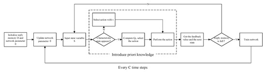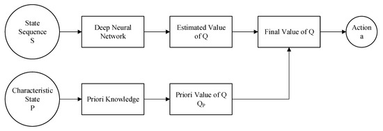 - According to the above definition, after the prior knowledge is added, the final action selection value is . First normalize , then calculate , and the calculation formula is:where is the value vector selected by DQN algorithm according to the action estimated by the current state. When the characteristic state appears, the value of each action is calculated according to Formula (7), and the action is directly selected according to the maximum value; when the characteristic state does not appear, the value of the action is estimated according to the DQN algorithm, and then the action is selected according to the rule. There are three main advantages: firstly, by introducing prior knowledge, when the feature state is detected, it can affect the action selection process according to the prior knowledge , reducing unnecessary exploration; second, the introduction of prior knowledge does not affect the training process of the algorithm; finally, when there is no feature state, it can judge the action selection through the algorithm to fully explore the state space. The introduction process of prior knowledge is shown in Figure 7.