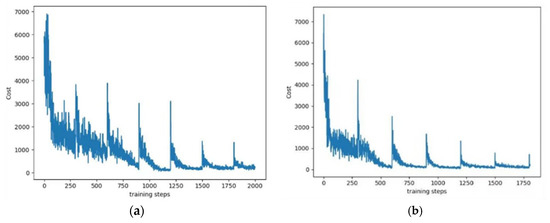 (a) Performance of the DQN learning curve in simulation environment; (b) Performance of the PK-DQN learning curve in simulation environment. The X coordinate represents the number of training steps, that is, the total steps of confrontation training; the Y coordinate represents the size of the cost curve value .